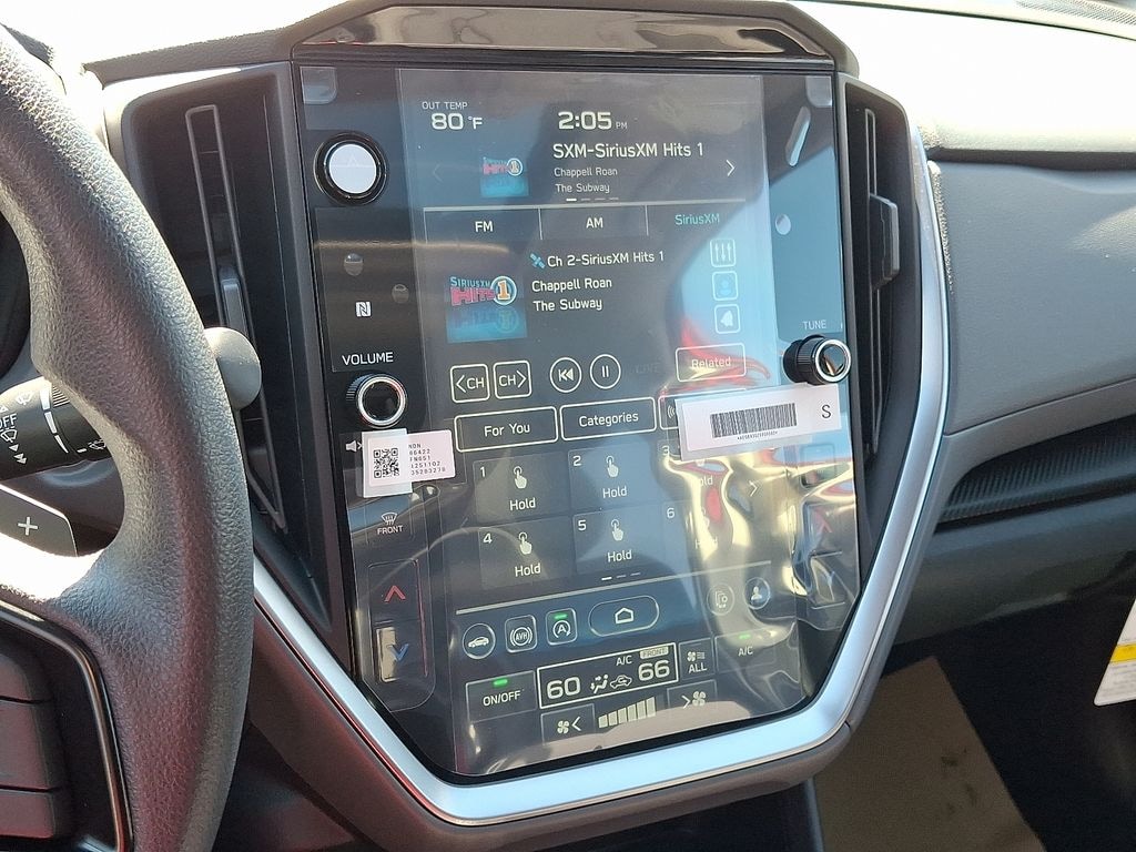 4-Wheel Disc Brakes, 6 Speakers, ABS brakes, Air Conditioning, Alloy wheels, AM/FM radio: SiriusXM, Anti-whiplash front head restraints, Auto High-beam Headlights, Automatic temperature control, Brake assist, Bumpers: body-color, Cloth Upholstery, Driver door bin, Driver vanity mirror, Dual front impact airbags, Dual front side impact airbags, Electronic Stability Control, Emergency communication system, Exterior Parking Camera Rear, Four wheel independent suspension, Front anti-roll bar, Front Bucket Seats, Front Center Armrest, Front dual zone A/C, Front fog lights, Front reading lights, Fully automatic headlights, Illuminated entry, Knee airbag, Low tire pressure warning, Occupant sensing airbag, Outside temperature display, Overhead airbag, Overhead console, Panic alarm, Passenger door bin, Passenger vanity mirror, Power door mirrors, Power steering, Power windows, Radio data system, Radio: Subaru 11.6" Multimedia Plus System, Rear anti-roll bar, Rear seat center armrest, Rear window defroster, Rear window wiper, Remote keyless entry, Security system, Speed control, Speed-sensing steering, Split folding rear seat, Spoiler, Steering wheel mounted audio controls, Tachometer, Telescoping steering wheel, Tilt steering wheel, Traction control, Trip computer, Turn signal indicator mirrors, Variably intermittent wipers, Wheels: 17" x 7.0" J Machine Finish Aluminum-Alloy.