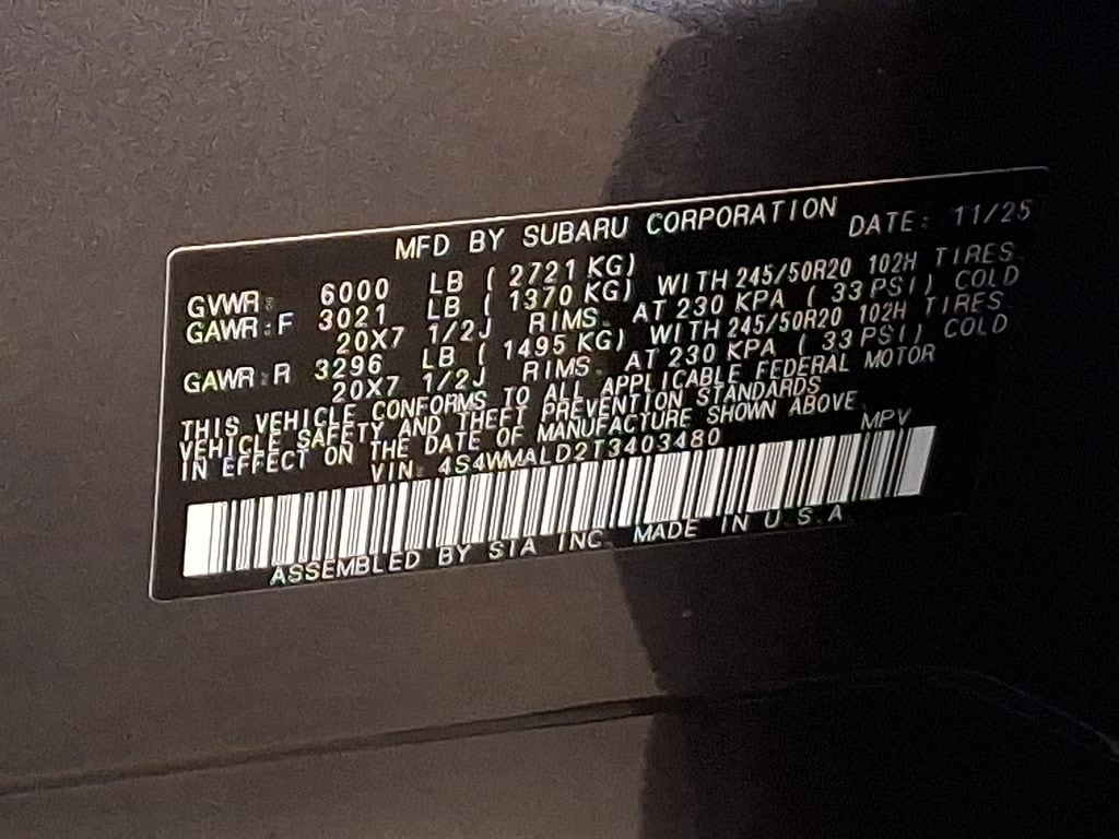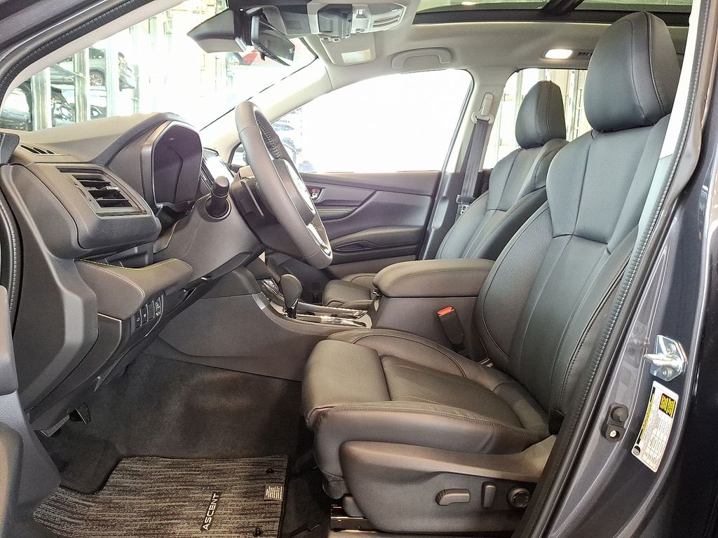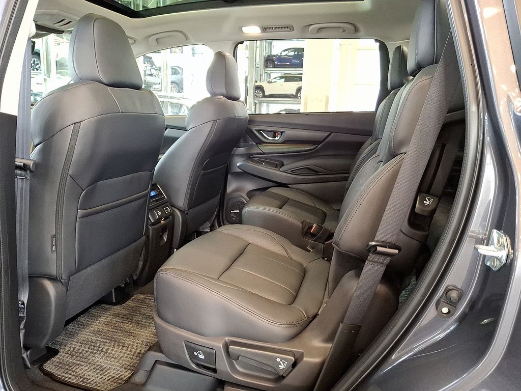 14 Speakers, 3rd row seats: bench, 4-Wheel Disc Brakes, ABS brakes, Air Conditioning, Alloy wheels, AM/FM radio: SiriusXM with 360L, Apple CarPlay & Android Auto, Auto High-beam Headlights, Auto-Dimming Exterior Mirror with Approach Light, Auto-dimming Rear-View mirror, Automatic temperature control, Black Chrome Rear Bumper Cover, Brake assist, Bumpers: body-color, Compass, Delay-off headlights, Driver door bin, Driver vanity mirror, Dual front impact airbags, Dual front side impact airbags, Electronic Stability Control, Emergency communication system: MySubaru Companion (5-years free), Exterior Parking Camera Rear, Four wheel independent suspension, Front anti-roll bar, Front Bucket Seats, Front Center Armrest, Front dual zone A/C, Front fog lights, Front reading lights, Fully automatic headlights, Garage door transmitter: HomeLink, harman/kardon® Speakers, Heated and Ventilated Front Bucket Seats, Heated door mirrors, Heated front seats, Heated rear seats, Heated steering wheel, HVAC memory, Illuminated entry, Knee airbag, Leather Shift Knob, Leather steering wheel, LED Cargo Area Lighting, Low tire pressure warning, Memory seat, Navigation system: MySubaru Navigator (1-year trial), Occupant sensing airbag, Outside temperature display, Overhead airbag, Overhead console, Panic alarm, Passenger door bin, Passenger vanity mirror, Perforated Nappa Leather-Trimmed Upholstery, Power door mirrors, Power driver seat, Power Liftgate, Power moonroof, Power passenger seat, Power steering, Power windows, Radio data system, Radio: Subaru 11.6" Multimedia System with Navigation, Rain sensing wipers, Rear air conditioning, Rear anti-roll bar, Rear reading lights, Rear window defroster, Rear window wiper, Reclining 3rd row seat, Remote keyless entry, Security system, Speed control, Speed-sensing steering, Splash Guards, Split folding rear seat, Spoiler, Standard Model, Steering wheel mounted audio controls, Tachometer, Telescoping steering wheel, Tilt steering wheel, Traction control, Trip computer, Turn signal indicator mirrors, Variably intermittent wipers, Ventilated front seats, Wheels: 20" x 7.5 J Black Finish Aluminum Alloy.