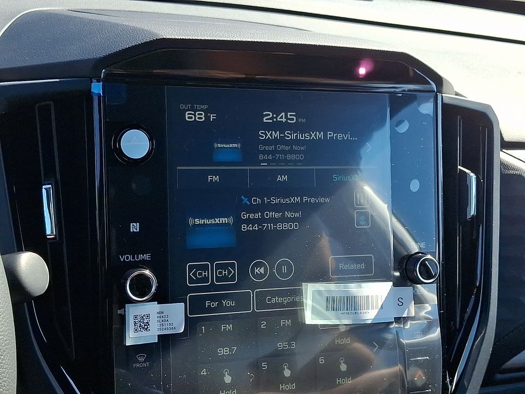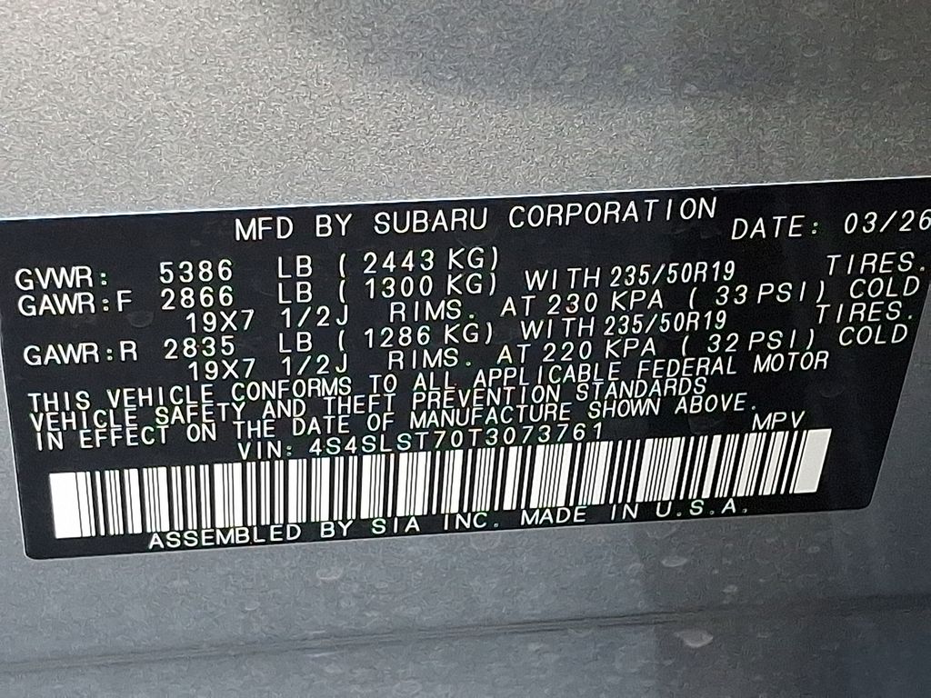 11 Speakers, 4-Wheel Disc Brakes, ABS brakes, Air Conditioning, Alloy wheels, AM/FM radio: SiriusXM with 360L, Anti-whiplash front head restraints, Auto High-beam Headlights, Automatic temperature control, Brake assist, Bumpers: body-color, Compass, Driver door bin, Driver vanity mirror, Dual front impact airbags, Dual front side impact airbags, Electronic Stability Control, Emergency communication system: MySubaru Companion (5-years free), Exterior Parking Camera Rear, Four wheel independent suspension, Front anti-roll bar, Front Bucket Seats, Front Center Armrest, Front dual zone A/C, Front fog lights, Front reading lights, Fully automatic headlights, harman/kardon® Speakers, Heated and Ventilated Front Bucket Seats, Heated door mirrors, Heated front seats, Heated rear seats, Heated steering wheel, HVAC memory, Illuminated entry, Knee airbag, Low tire pressure warning, Memory seat, Navigation System, Occupant sensing airbag, Outside temperature display, Overhead airbag, Overhead console, Panic alarm, Passenger door bin, Passenger vanity mirror, Perforated Leather-Trimmed Upholstery, Power door mirrors, Power driver seat, Power Liftgate, Power moonroof: Panoramic, Power passenger seat, Power steering, Power windows, Radio data system, Radio: Subaru 11.6" Multimedia Navigation System, Rear anti-roll bar, Rear seat center armrest, Rear window defroster, Rear window wiper, Remote keyless entry, Security system, Speed control, Speed-sensing steering, Split folding rear seat, Spoiler, Steering wheel mounted audio controls, Tachometer, Telescoping steering wheel, Tilt steering wheel, Traction control, Trip computer, Turn signal indicator mirrors, Variably intermittent wipers, Ventilated front seats, Wheels: 19" x 7.5 J Dark Gray Aluminum-Alloy.