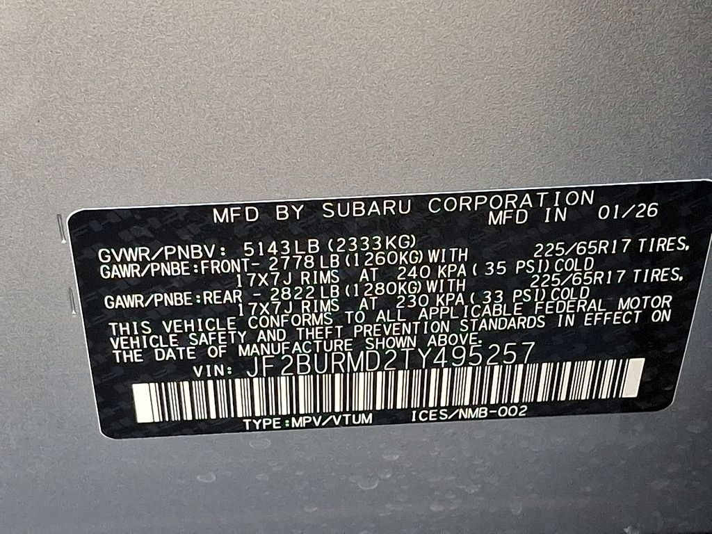12 Speakers, 4-Wheel Disc Brakes, ABS brakes, Air Conditioning, Alloy wheels, AM/FM radio: SiriusXM with 360L, Anti-whiplash front head restraints, Auto High-beam Headlights, Automatic temperature control, Blind Spot Warning, Brake assist, Bumpers: body-color, Driver door bin, Driver vanity mirror, Dual front impact airbags, Dual front side impact airbags, Electronic Stability Control, Emergency communication system: MySubaru Companion (5-years free), Exterior Parking Camera Rear, Four wheel independent suspension, Front anti-roll bar, Front Bucket Seats, Front Center Armrest w/Storage, Front dual zone A/C, Front fog lights, Front reading lights, Fully automatic headlights, harman/kardon® Speakers, Heated door mirrors, Heated Front Bucket Seats, Heated front seats, Heated rear seats, Heated steering wheel, HVAC memory, Illuminated entry, Knee airbag, Leather Shift Knob, Leather steering wheel, Low tire pressure warning, Occupant sensing airbag, Outside temperature display, Overhead airbag, Overhead console, Panic alarm, Passenger door bin, Passenger vanity mirror, Power door mirrors, Power driver seat, Power Liftgate, Power steering, Power windows, Radio: Subaru 12.1" Multimedia System, Rain sensing wipers, Rear anti-roll bar, Rear seat center armrest, Rear window defroster, Rear window wiper, Remote keyless entry, Security system, Speed control, Speed-sensing steering, Split folding rear seat, Spoiler, StarTex-Trimmed Upholstery, Steering wheel mounted audio controls, Tachometer, Telescoping steering wheel, Tilt steering wheel, Traction control, Trip computer, Turn signal indicator mirrors, Variably intermittent wipers, Wheels: 17" x 7J Matte Black Finish Aluminum-Alloy.
