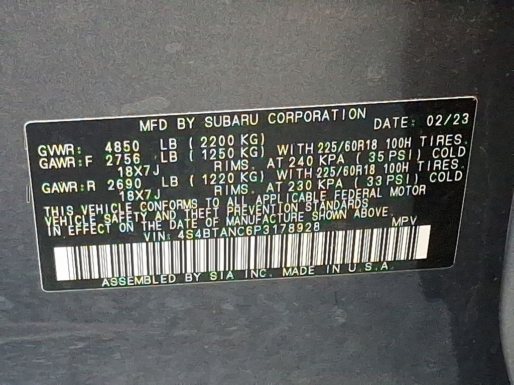 12 Speakers, 3.90 Axle Ratio, 4-Wheel Disc Brakes, ABS brakes, Air Conditioning, All-Weather Floor Liners, Alloy wheels, AM/FM radio: SiriusXM, Auto High-beam Headlights, Auto-Dimming Exterior Mirror w/Approach Light, Auto-dimming Rear-View mirror, Automatic temperature control, Brake assist, Bumpers: body-color, Compass, Driver door bin, Driver vanity mirror, DriverFocus (Driver Monitoring System), Dual front impact airbags, Dual front side impact airbags, Electronic Stability Control, Emergency communication system: STARLINK Safety Plus (3-year free trial), Exterior Parking Camera Rear, Four wheel independent suspension, Front anti-roll bar, Front Bucket Seats, Front Center Armrest w/Storage, Front dual zone A/C, Front fog lights, Front reading lights, Fully automatic headlights, Garage door transmitter: HomeLink, harman/kardon® Speakers, Heated door mirrors, Heated Front Bucket Seats, Heated front seats, Heated rear seats, Heated Steering Wheel, Illuminated entry, Knee airbag, Leather Shift Knob, Leather steering wheel, Low tire pressure warning, Memory seat, Occupant sensing airbag, Outside temperature display, Overhead airbag, Overhead console, Panic alarm, Passenger door bin, Passenger vanity mirror, Perforated Leather-Trimmed Upholstery, Power door mirrors, Power driver seat, Power Liftgate, Power Moonroof, Power Moonroof & HSW & Navigation System, Power passenger seat, Power steering, Power windows, Radio: Subaru STARLINK 11.6" Multimedia Nav System, Radio: Subaru STARLINK 11.6" Multimedia Plus Sys, Rear anti-roll bar, Rear Bumper Cover, Rear seat center armrest, Rear window defroster, Rear window wiper, Remote keyless entry, Roof rack, Security system, Speed control, Speed-sensing steering, Splash Guards, Split folding rear seat, Spoiler, Steering wheel mounted audio controls, Steering Wheel Paddle Shift Control Switches, Tachometer, Telescoping steering wheel, Tilt steering wheel, Traction control, Trip computer, Turn signal indicator mirrors, Variably intermittent wipers, Wheels: 18" x 7J Black Aluminum Alloy, Wireless Charger.